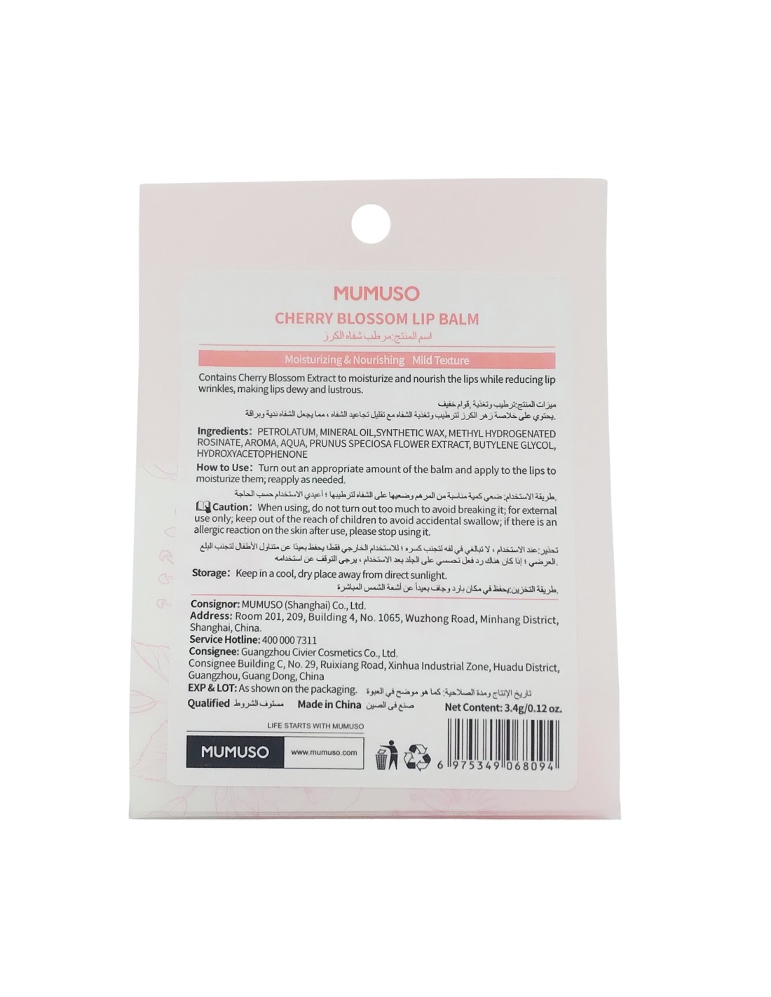 Ce baume à lèvres à l'extrait de fleur de cerisier de MUMUSO, a non seulement un parfum merveilleusement doux - rappelant les fleurs de cerisier fraîchement cueillies - mais est également un véritable soin réparateur pour vos lèvres. Utilisé régulièrement, il laisse les lèvres régénérées et protégées contre les agressions extérieures. Il contient toute une variété d’ingrédients, dont l'acide hyaluronique, pour hydrater et protéger les lèvres; ainsi que de l’extrait de feuille de thym, qui a des propriétés antibactériennes et antioxydantes, et finalement du menthol pour une sensation de fraîcheur. Le parfum fleuri et doux de la fleur de cerisier enchantera vos lèvres et réveillera la fièvre du printemps en vous !