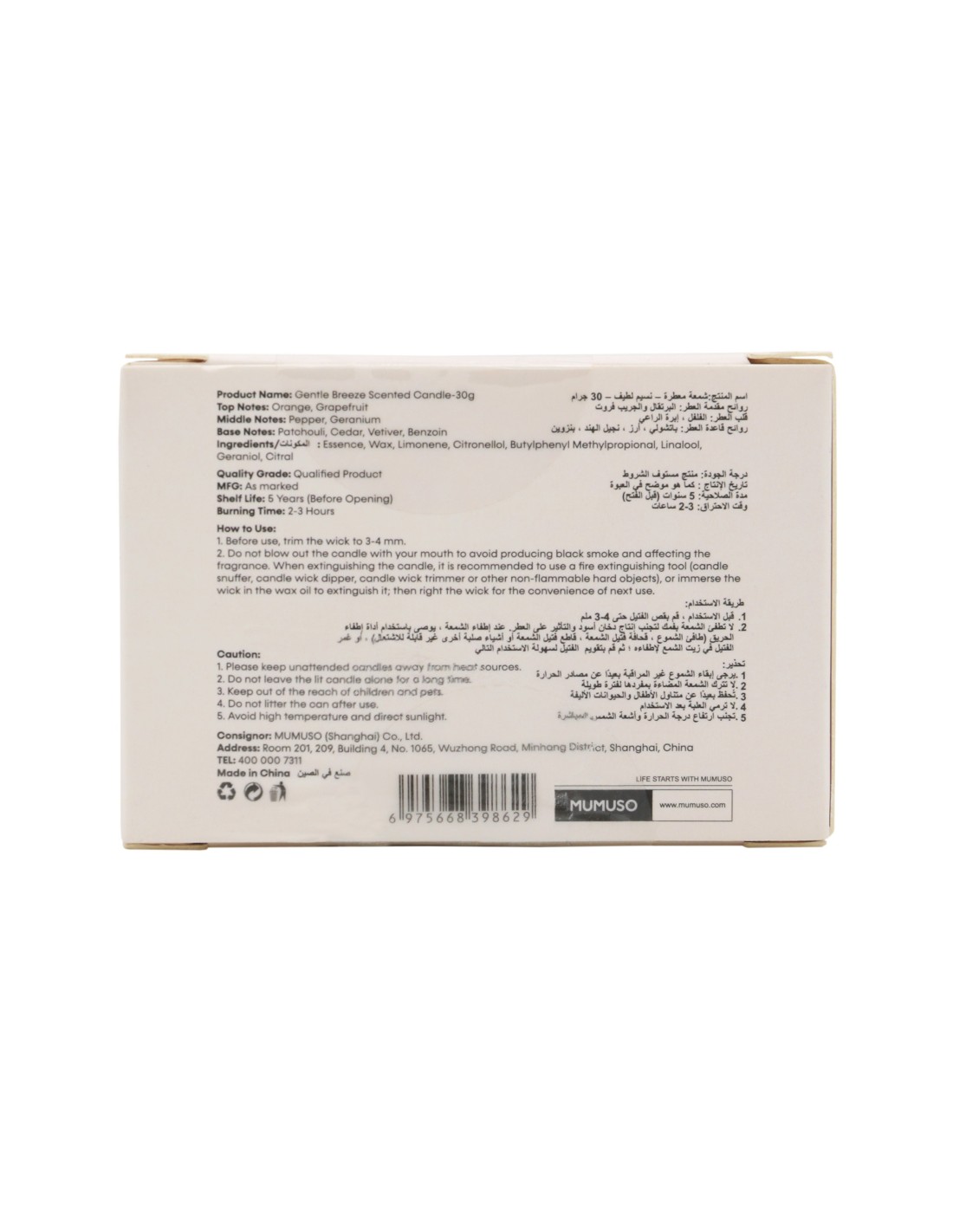 La bougie parfumée "Gentle Breeze" de 30g de MUMUSO propose une expérience olfactive délicate. Les notes d'agrumes pétillantes d'orange et de pamplemousse apportent une fraîcheur délicate, tandis que les notes de poivre et de géranium ajoutent une touche épicée et florale. Les nuances de bois, comprenant le patchouli, le cèdre, le vétiver et le benjoin, offrent une base chaleureuse et enveloppante. Avant de l'allumer, il est recommandé de tailler la mèche à une longueur de 3 à 4 mm pour une combustion optimale.