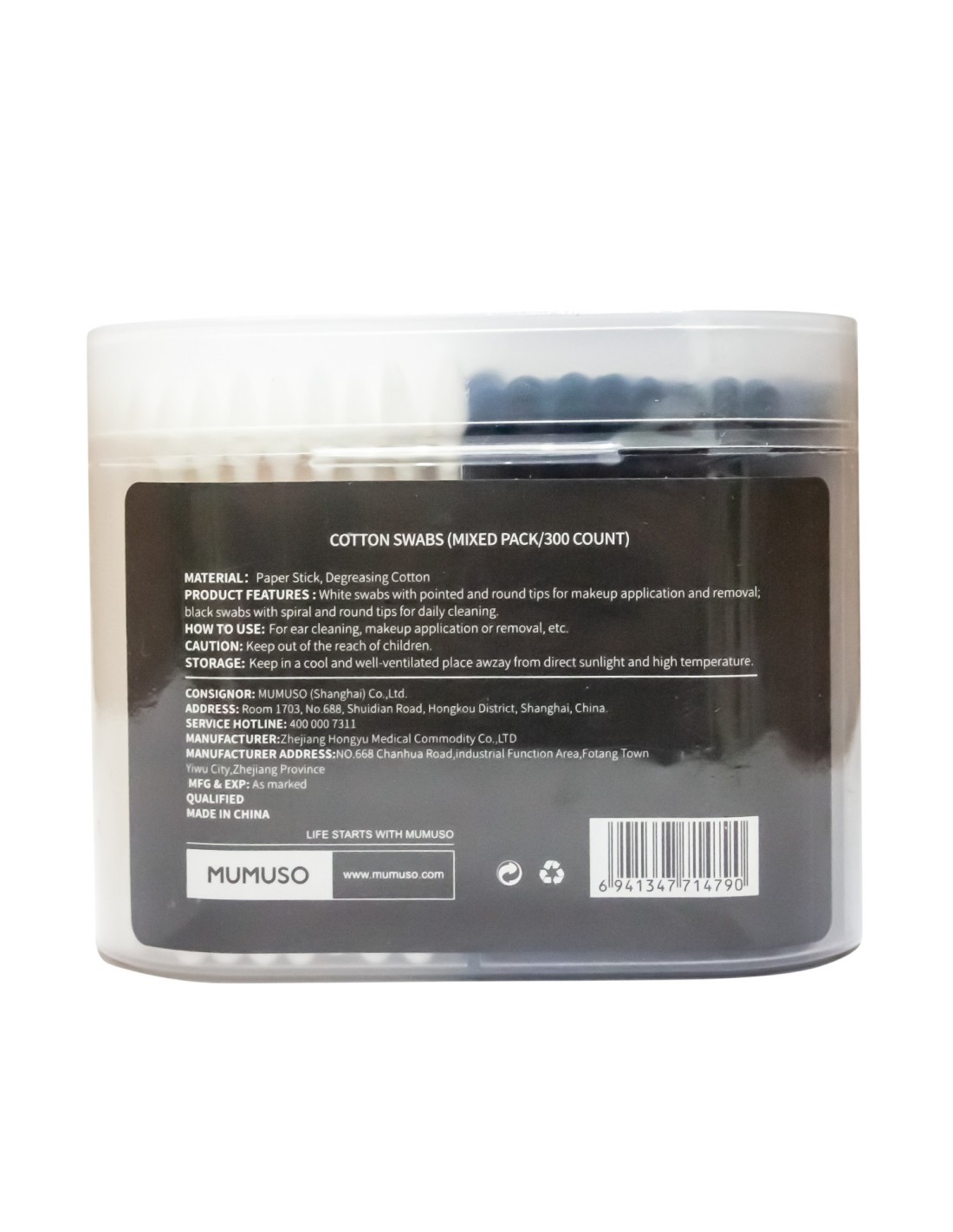 Ce pack de Mumuso contient 3 unités de coton-tiges pour une utilisation prolongée et économique. Les deux types de coton-tiges blancs et noirs sont conçus pour des usages spécifiques d’application/démaquillage et de nettoyage quotidien respectivement. Les extrémités pointues, rondes et spiralées offrent une grande précision et efficacité pour une utilisation confortable et hygiénique.