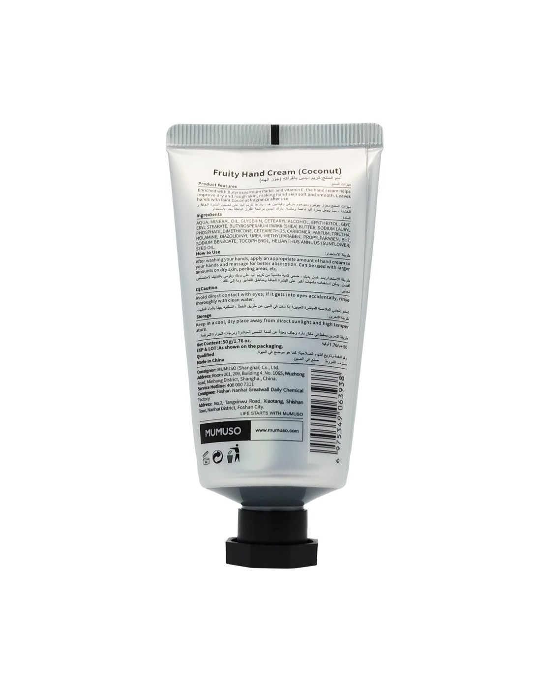 Enrichie en Butyrospermum Parkii (beurre de karité) et en vitamine E, la crème pour les mains fruitée de MUMUSO aide à améliorer la peau sèche et rugueuse, rendant la peau des mains douce et lisse. Laisse un léger parfum de noix de coco sur les mains après utilisation.