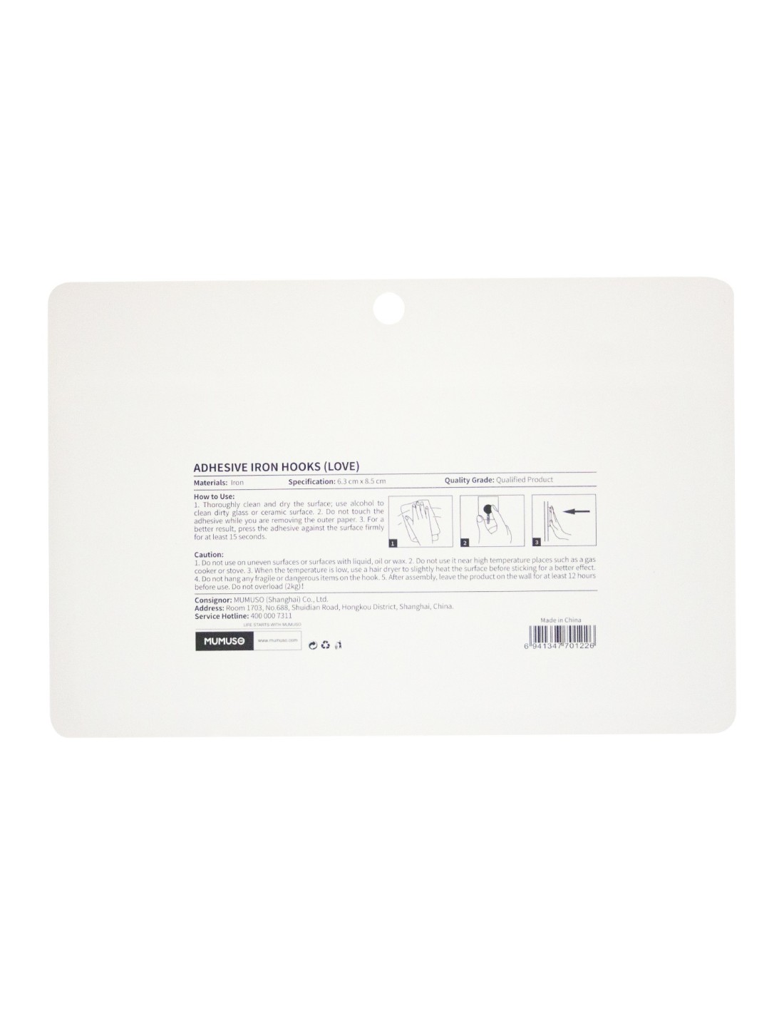 Pas besoin de percer des trous dans le mur et pas d'outils, ce crochet auto-adhésif "LOVE" de MUMUSO est très facile à installer. Il suffit de décoller le film protecteur à l'arrière et collez-le au mur. Ce crochet pourra supporter des articles maximums de 2 kg. Le crochet mural doit être collé sur une surface lisse, il ne convient pas pour les murs rudes, tels que les murs peints. Attendez 24 heures avant de placer les articles.1. Ne pas utiliser sur des surfaces inégales ou des surfaces contenant du liquide, de l'huile ou de la cire. 2. Ne l'utilisez pas à proximité d'endroits à haute température tels qu'une cuisinière à gaz ou une cuisinière. 3. Lorsque la température est basse, utilisez un sèche-cheveux pour chauffer légèrement la surface avant de coller pour un meilleur effet. 4. Ne suspendez aucun objet fragile ou dangereux au crochet. 5. Après assemblage, laissez le produit sur le mur pendant au moins 12 heures avant utilisation. Ne pas surcharger (2kg) !
