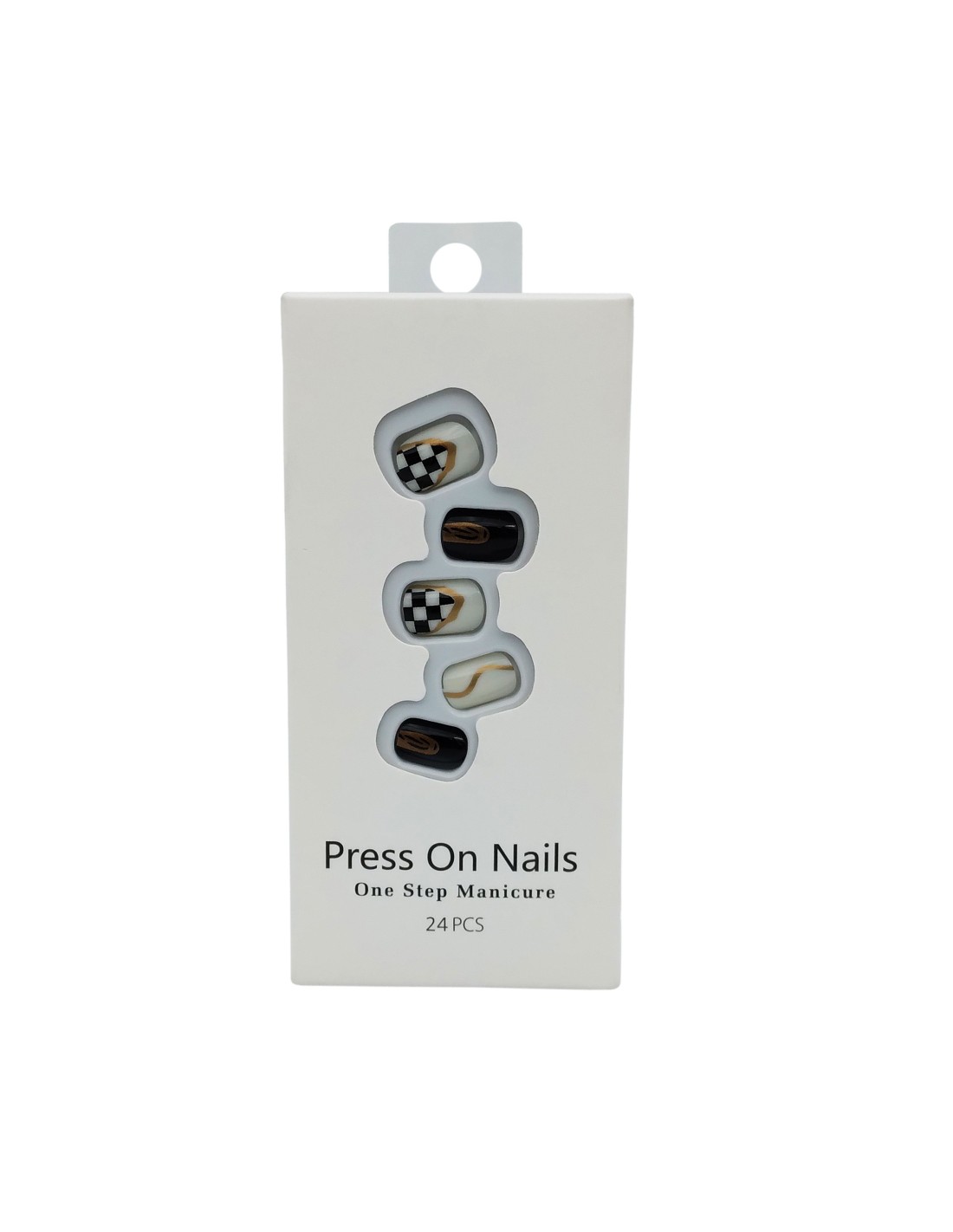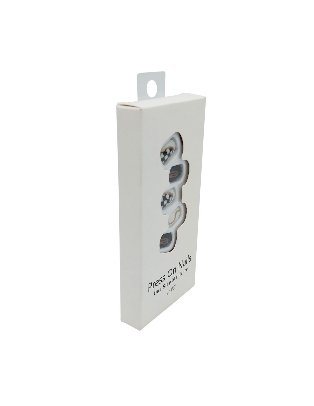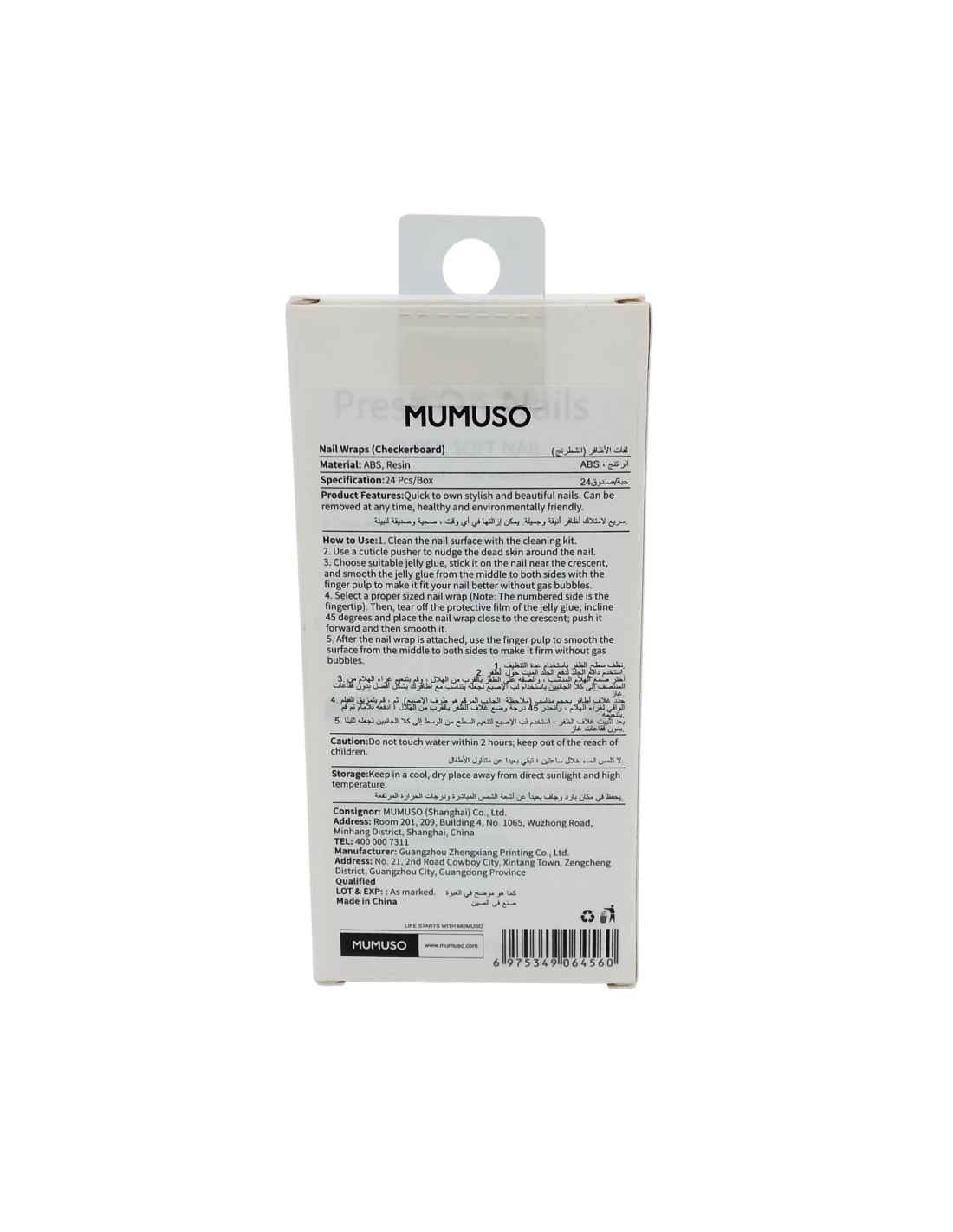 Obtenez rapidement des ongles élégants et beaux grâce aux faux-ongles de MUMUSO, qui peuvent être retirés à tout moment, sains et respectueux de l'environnement. Le motif damier des faux-ongles de MUMUSO vendus en paquet de 24 unités fera craquer toutes les nail addict·e·s. avec ses petits carreaux bicolores et bien ordonnés, revisités sur une touche de fond marbré blanc / doré, avec d'autres ongles noirs ou blancs, à vous de faire les compositions que vous voulez et de développer votre fibre artistique. Le motif du plateau de jeu d’échecs commence en effet à envahir nos ongles pour leur donner un look fun à souhait pile pour colorer cette saison ! Les avantages des faux ongles de MUMUSO : •Économiques et écologiques, nos faux ongles sont réutilisables. Fini les grosses sommes dépensées chez l’esthéticienne tous les mois ! •Adaptés à votre mode de vie, vous pouvez les garder le temps d’une soirée ou plus, c’est vous qui choisissez ! •Rapide et très simple, la pose est très simple et se fait en quelques minutes. •Respectueuse de votre santé, la pose n’abîme pas vos ongles naturels et évite l’accumulation de bactéries sous les ongles du au port prolongé . •Pratique, vous pouvez les emporter partout où vous voulez !
