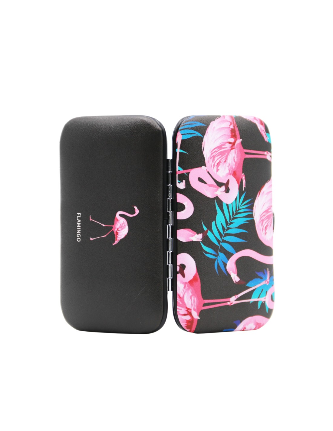 Le set de manucure noir et argenté ( 5 pièces) de MUMUSO est livré dans un étui en similicuir très oliment décoré avec des flamants roses. L'ensemble se compose de deux coupe-ongles différents (un large et un plus étroit pour les travaux de détail, par exemple pour les cuticules sèches ou rugueuses), une lime à ongles en métal, une pince à épiler et un repousse-cuticule ( à utiliser aussi comme cure-oreille). Un ensemble de manucure à la fois pratique et élégant.