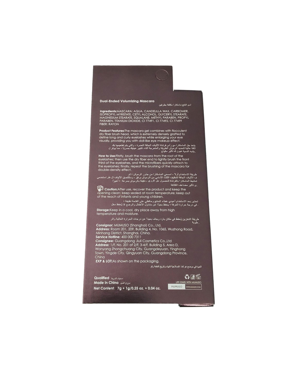 Le gel de mascara se combine à la tête de brosse en fibres sèches floculantes, vous offrant un effet de maquillage des yeux digne d'une poupée. Ces formules sont conçues pour volumiser, allonger, relever et recourber les cils. Le mascara de MUMUSO, DUAL-ENDED VOLUMIZING MASCARA (BLACK), glisse en douceur sur les cils pour une application uniforme, modulable et sans paquets. Le mascara comporte deux brosses personnalisées et des formules conçues pour vous donner LES cils parfaits. Que vous utilisiez les deux cotés ensemble ou séparément, ce mascara vous permet de personnaliser votre look selon votre humeur ! - Volume : Cette formule comporte des fibres volumisantes à faible gravité pour un volume incroyable sans poids ni rigidité. La formule comprend des cires et des fibres agrippantes pour un effet allongé immédiat avec une brosse innovante pour booster la longueur, définir et recourber même vos cils les plus minuscules.