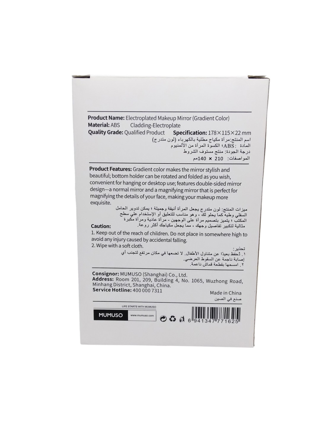 Les couleurs dégradées rajoutent une touche d'élégance au miroir double face de MUMUSO ; le support inférieur peut être tourné comme vous le souhaitez, pratique pour être tenu à la main, suspendu ou utilisé sur le bureau. Lorsque la poignée est pliée, le miroir peut être emballé dans une valise ou se glisser facilement dans votre bagage à main, parfait pour une utilisation quotidienne ou en voyage. Le support réglable vous permet de l'ajuster à un angle parfait en laissant vos mains libres lorsque vous vous maquillez et que vous voyez votre visage de près.