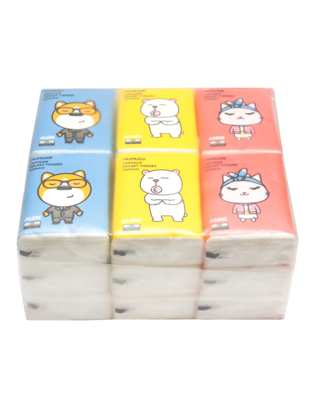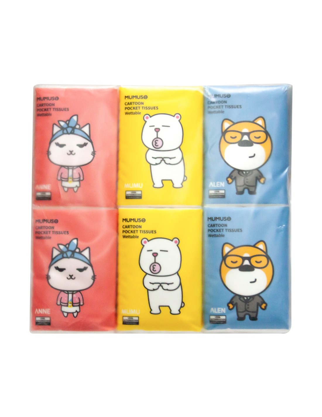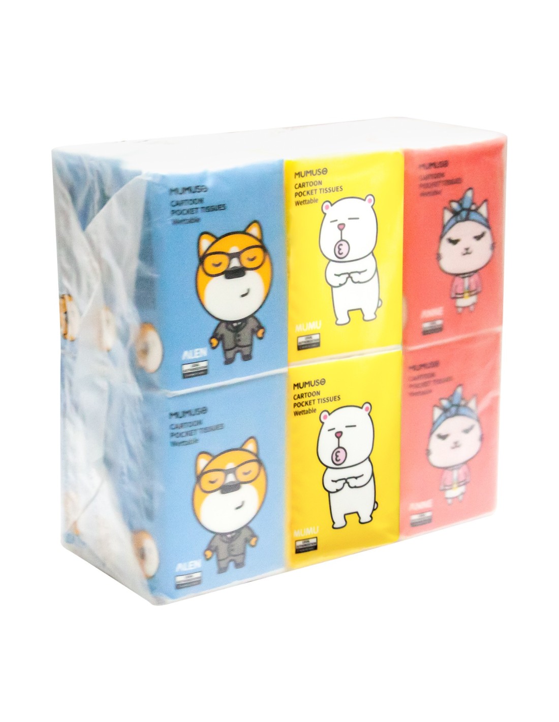 Ce pack de 18 mouchoirs de poche MUMUSO est à la fois attrayant et pratique. Arborant des couleurs vives et mettant en avant les personnages Mumu, Alen et Anne, ces mouchoirs sont parfaits pour toute la famille. Fabriqués avec une qualité premium, ils sont adaptés à une utilisation sèche ou humide, offrant douceur et confort pour votre visage.