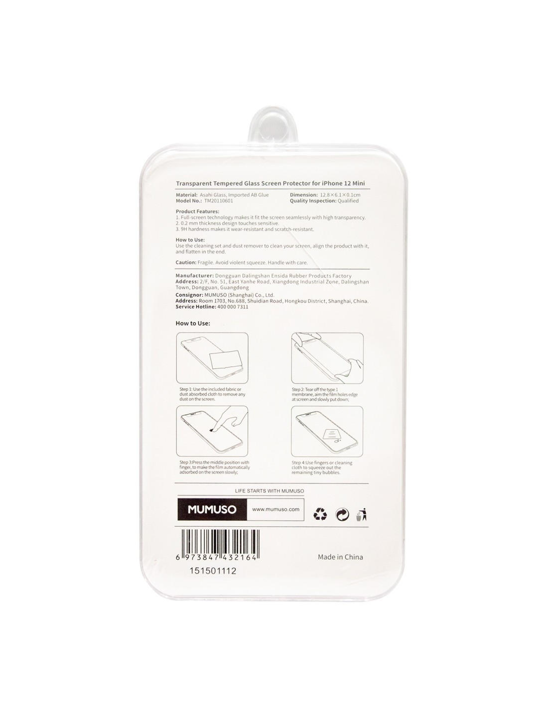 Le protecteur d'écran de Mumuso conçu pour l'Apple iPhone 12 Mini est fait de verre trempé de haute qualité. La taille précise de découpe au laser peut couvrir entièrement l'écran du téléphone et fournir une protection maximale à votre téléphone. Conception tactile d'une épaisseur de 0,2 mm, La dureté 9H le rend résistant à l'usure et aux rayures.